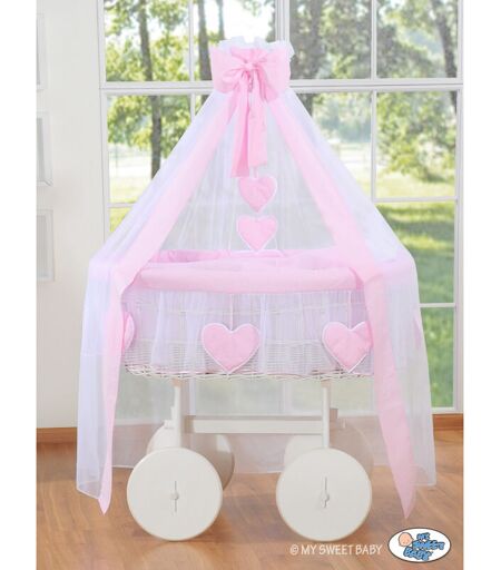 Cestino in vimini per neonati. Romantico bordo in cotone colorato e tulle bianco, con cuori decorativi. Il baldacchino in velo può essere utilizzato anche come zanzariera. Cestino in vimini per neonati da un'azienda rinomata MY SWEET BABY, produttore leader in Europa di tali cestini. Tessuti di altissima qualità, certificati Okotex e TUV. Romantico bordo in cotone colorato e tulle bianco, con cuori decorativi intorno al cestello e sul cappuccio. Il telo in voile può essere utilizzato anche come zanzariera. Disponibile in 4 colori: bianco, crema, rosa e blu. Un'ottima soluzione sia per piccoli appartamenti che per case. Le grandi ruote rendono il cestino facile da spostare. Questo significa che il tuo bambino sarà sempre con te. Può anche dormire comodamente sul balcone o in giardino: il cestino ha molto più spazio della navicella del passeggino. Il set include: - cestino in vimini bianco, - telaio in legno bianco, - 4 grandi ruote in legno con pneumatici in gomma, - rivestimento del ...