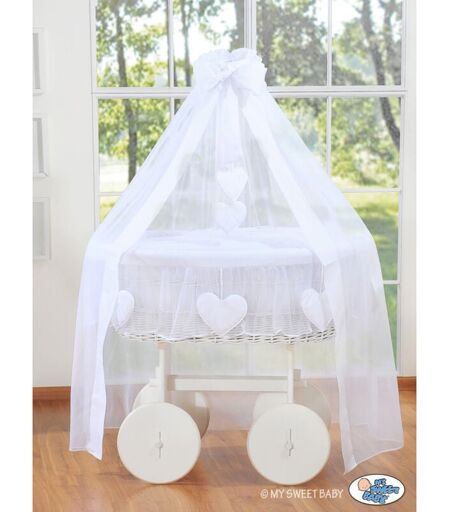 Cestino in vimini per neonati. Romantico bordo in cotone colorato e tulle bianco, con cuori decorativi. Il baldacchino in velo può essere utilizzato anche come zanzariera. Cestino in vimini per neonatiDa un'azienda rinomataMY SWEET BABY, produttore leader in Europa di questo tipo di ceste. Tessuti di altissima qualità, certificati Okotex e TUV. Romantico bordo in cotone colorato e tulle bianco, con cuori decorativi intorno al cesto e sul baldacchino. Il baldacchino in voile può essere utilizzato anche come zanzariera. Disponibile in 4 colori: bianco, crema, rosa e blu. Un'ottima soluzione sia per piccoli appartamenti che per case. Le grandi ruote rendono il cestino facile da spostare. Questo significa che il tuo bambino è sempre con te. Può anche dormire comodamente sul balcone o in giardino: il cestino ha molto più spazio della navicella del passeggino. Il set include: - cestino in vimini bianco, - telaio in legno bianco, - 4 grandi ruote in legno con pneumatici in gomma, ...