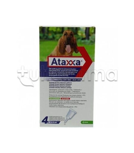 Ataxxa (equivalente di Advantix Bayer) è un antiparassitario per cani. E' indicato per cani che pesano più di 25kg. 1 pipetta da applicare ogni 4 settimane. ...