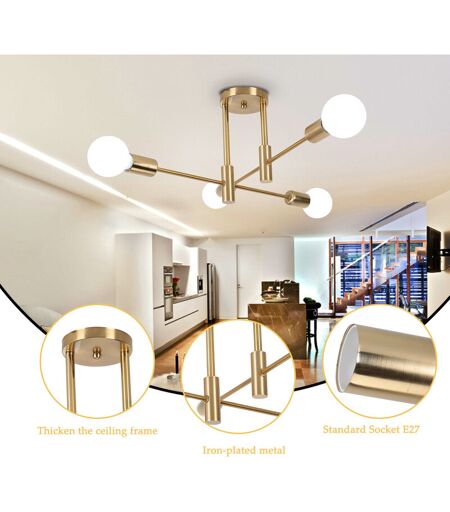 Caratteristico Plafoniera industriale, lampada da soffitto vintage retrò a 4 luci, lampadari moderni lampada a sospensione a soffitto E27 per soggiorno camera da letto cucina oro. Plafoniera in metallo, lavorazione squisita, alte prestazioni, antiossidante, anticorrosione, non facile da sbiadire o arrugginire. La struttura è stabile e non facile da danneggiare. Plafoniera retrò a 4 fiamme adatta a tutti gli stili di arredamento, È possibile regolare la posizione dei rami in base alle proprie preferenze, Installazione fai da te. Specifiche del lampadario Sputnik: Nome del prodotto: plafoniera moderna. Materiale: superficie galvanica in metallo ferro battuto Colore: oro Presa: 4 prese E27 Prese: presa E27 Tipi di lampadine applicabili: lampadine a risparmio energetico, lampadine a incandescenza e lampadine a LED. Tensione: 110-240 V Potenza massima compatibile: 40 Watt Promemoria amichevole: deve essere installato da un elettricista qualificato. Per pulire o sostituire la lampada ...