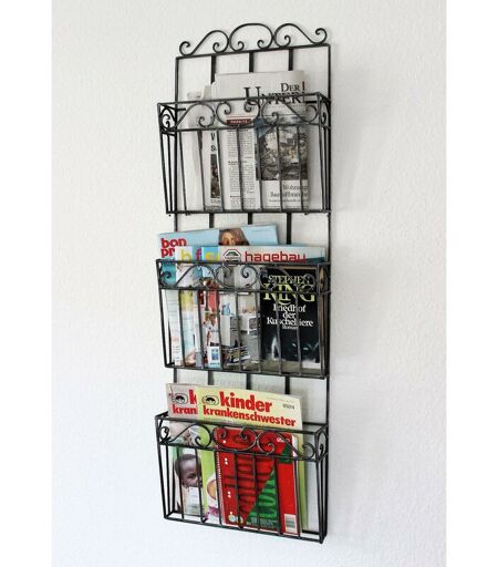 Portagiornali da scaffale a parete. Molto decorativo. Forgiato in metallo e dipinto con colori laccati di alta qualità. Colore marrone. Dimensioni: altezza circa 101 cm, larghezza circa 33 cm, profondità circa 8 cm. ...