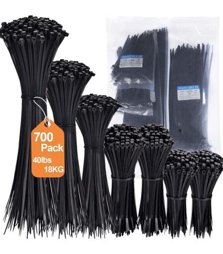 ALOVEZ 700 Pièces Colliers de Serrage en Nylon 3.6mm x 100/150/200/250/300mm Attaches Câble Noirs, Serre-Câbles Robustes pour Maison/Bureau/Jardinage et