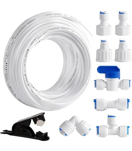 【Specifiche universali】Il kit di collegamento universale per l'alimentazione idrica consente di collegare frigoriferi side-by-side, sistemi a osmosi inversa, acquari e vari filtri per l'acqua con un tubo da 6,35 mm (1/4"). 【Contenuto della confezione】 Tubo flessibile per l'acqua da 20 m, 1 raccordo a gomito da 1/4" a 90°, 1 valvola di intercettazione da 1/4", 1 raccordo dritto da 1/4", 1 raccordo rapido da 1/4", 1 raccordo a T da 1/4", 1 raccordo per rubinetto da 1/4", 1 raccordo per rubinetto da 1/2", 2 raccordi per rubinetto da 3/2". Raccordo per rubinetto da 4", 1 tagliatubi, 15 anelli di sicurezza. 【Facile da installare】Non sono necessari attrezzi per l'installazione. I connettori rapidi a innesto offrono una facile esperienza di installazione fai da te. Utilizzare un tagliatubi, è possibile tagliare il tubo alla lunghezza desiderata da soli. Materiale di alta qualità: il cavo di alimentazione dell'acqua è realizzato in materiale POM di alta qualità per uso alimentare, resistente ...