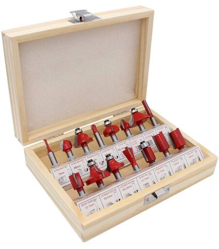 LANGRAY Set di 15 punte per fresa in carburo di tungsteno con gambo da 6,35 mm, per scanalature, per legno, con custodia in legno.