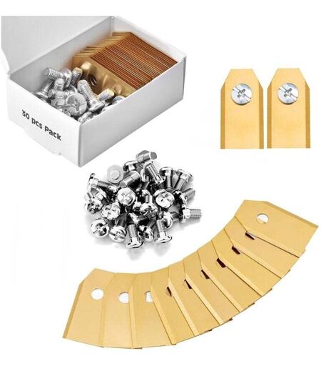 Compatibilità: 30 lame di ricambio in titanio sono compatibili con tutti i modelli di robot tagliaerba Husqvarna Automower e Gardena. Perfetto e affidabile per un'ampia gamma di dispositivi. Taglio perfetto: goditi un taglio liscio e preciso grazie alla lama del robot rasaerba da 0,75 mm di spessore e 3 g di peso. Queste lame garantiscono una finitura impeccabile e una manutenzione minima per il tuo prato, lasciandolo sano e bello. Resistenza eccezionale: realizzate in acciaio inossidabile con rivestimento in titanio, adatte alle lame dei rasaerba Husqvarna, offrono una resistenza superiore a ruggine, acidi e alcali, garantendo una maggiore longevità e prestazioni costanti. Garantiscono un'affilatura duratura e tagli precisi. Sostituzione facile: l'installazione delle lame del rasaerba a doppia lama è rapida e semplice. Grazie alle nostre robuste viti, puoi sostituirle in modo sicuro e semplice per mantenere il tuo prato perfettamente curato. Versatilità: la lama del robot rasaerba ...