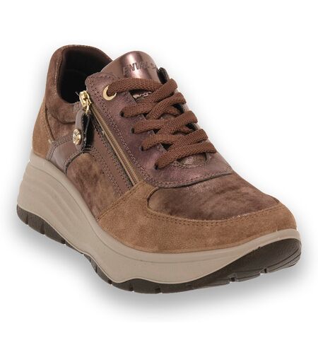 sneaker da donna enval soft con la tomaia in pelle satinato e scamosciata chiusa con lacci e cerniera laterale. fodera in tessuto sottopiede in pelle con memory foam fondo in gomma con zeppa alta 6 cm. scarpe made in italy. colore: bronzo/fango. ...