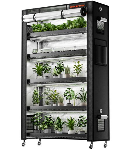 Quali sono i vantaggi del nuovo prodotto di Spider Farmer, Plant Stand con grow light? Full Spectrum Grow Light: Questo set di serra include 10 pz di luci a LED con 220w, uno scaffale per piante con luci per la crescita, ognuna dotata di riflettori per aumentare l'efficienza, incoraggiare la crescita delle piante e proteggere i tuoi occhi. 1680D Cresci Tenda: Realizzato con tessuto Oxford ad alta densità 1680D e alta riflettività, questa tenda impedisce efficacemente la perdita di luce e mantiene la tua area di crescita ben isolata. La copertura resistente aiuta a conservare calore e umidità, creando un ambiente ideale per la crescita delle piante. Dotato di una porta anteriore trasparente, permette di osservare facilmente le vostre piante senza aprire la tenda. Costruito una forte cerniera, finestra di osservazione e una comoda borsa per strumenti per funzionalità aggiuntive. Costruita per durare, questa tenda di crescita garantisce condizioni ottimali di crescita delle piante. ...