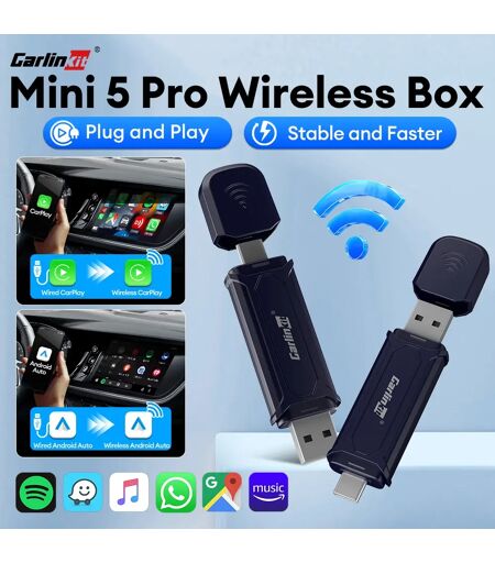 Carlinkit Mini 5 Pro 5.0 Wireless CarPlay e Android Auto Adattatore wireless 2 in 1 Smart Car Box Connessione stabile e veloce Dongle USB Doppio canale Funziona per CarPlay cablato o Android Auto Car