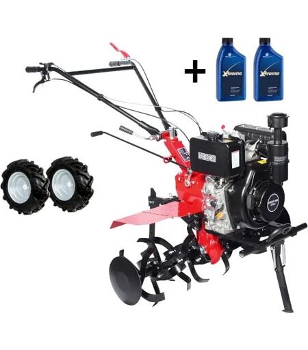 La motozappa diesel Dunsch DU43418-115D31S è un attrezzo maneggevole e allo stesso tempo pesante e solido, adatto per terreni di media grandezza. Capace di fresare anche la terra piú dura e difficile da lavorare, dotata di un potente motore diesel con 418 cc di cilindrata e 9 Cv di potenza. La zappa a motore diesel Dunsh è munita di 3 marce avanti e 1 retro, una robusta scatola del cambio in ghisa ed una trasmissione professionale con ingranaggi e filtro a bagno d'olio. Le stegole regolabili sia in altezza che lateralmente rendono agevole il lavoro della fresatura. La motozappa Dunsch è provvista di fresa con 4 gruppi di 4 lame ciascuno per una ampiezza di lavoro di 116 cm compreso di dischi di protezione ed una profondità massima 33 cm. Una macchina semplice da manovrare grazie all'impugnatura ergonomica regolabile in altezza e comandi sul manico. Dotata di supporto frontale e ruote tractor in gomma 4.00-8. IN OMAGGIO: 1 LT DI OLIO MOTORE 15W40 + 1 LT DI OLIO CAMBIO SAE90 Specifiche ...