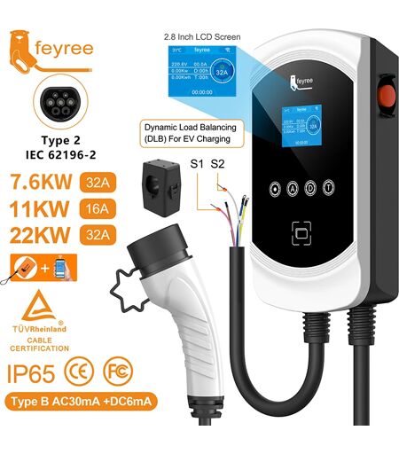 feyree EV Caricabatterie Type2 Cavo 32A 7.6kW Carica dinamica Blancing EVSE Wallbox APP Funzione 11kW 22kW Stazione di ricarica Auto elettrica ...