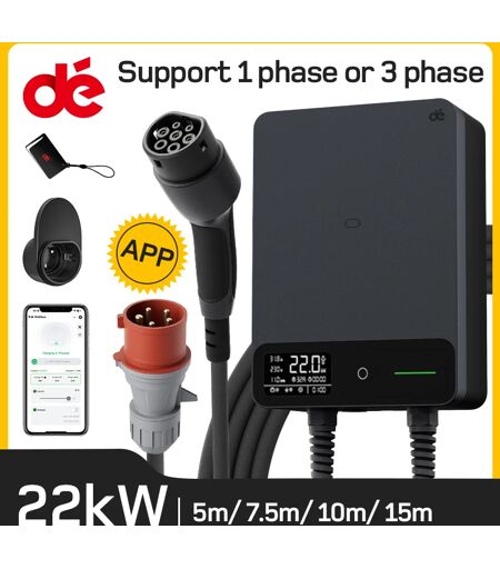 dé Wallbox 22kW 32A con APP, stazione di ricarica domestica 230V, cavo di ricarica 5m 7.5m 10m 15m, caricabatterie da CEE a tipo 2 EV nero