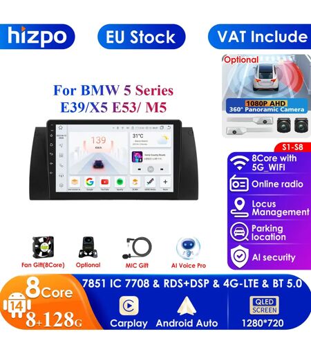 HIZPO 8 + 128G Android 12 autoradio lettore Video multimediale per BMW 5 E39 E53 X5 1995-2001 2002 2003 2004 2005 2006 navigazione GPS 2 Din