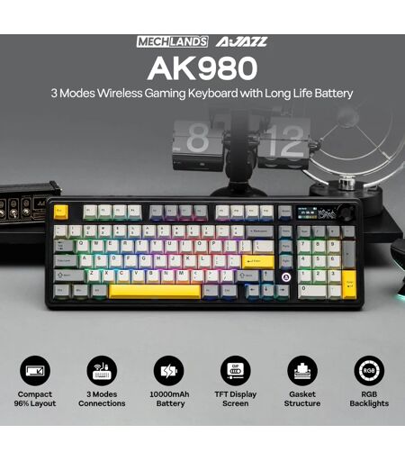 Ajazz Tastiera da gioco meccanica AK980, schermo TFT da 2,9 cm, manopola del volume, struttura della guarnizione a 98 tasti, illuminazione RGB, PR4 sostituibile a caldo