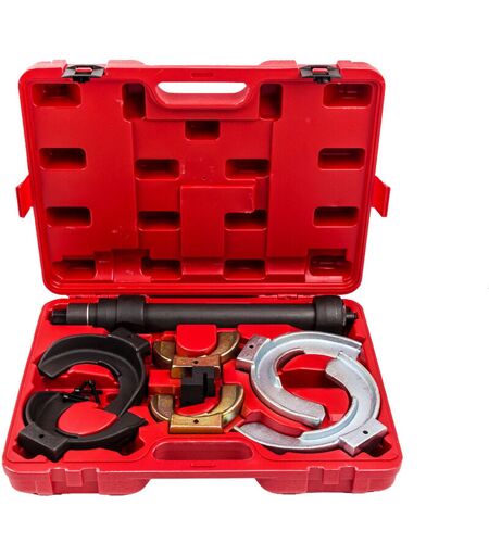 Switching from strut bearings, shock absorbers and springs is safe and easy with this professional tool. The 3 pairs of interchangeable spring retainers and the supplied spacer, allow compression of all forms and sizes of springs. Application for Fits for Mercedes Benz: W163, 164, 171, 210, 211, 219, 230, 245, 251, 203 & 209 (4-matic only). Fits for BMW: E31, E32, E34, E36, E38, E39, E52, E60, E61, E63, E64, E65, E66, E67, Z3, Z3 Coupe. Fits for Chrysler, for Daewoo, for Fiat, for Ford, for Honda, for Hyundia, for Jaquar, for Jeep, for KIA, for Mazda, for Benz C and E class, for Mistsubishi, for Nissan, for Opel, for Renault, for Mini, for Porsche, for Land Rover, for Saab, for Subaru, for Toyota, for Volvo, for VW. Not designed for use with impact wrench. Hand ratchet only. Jaw sizes Gold perch: 2.500" (65mm) - 4.920" (125mm). Black perch: 3.460" (88mm) - 6.300" (160mm). Silver perch: 4.960" (126mm) - 8.450" (215mm). Maximum perch distance 12.550". Technical Data Operated with a ...