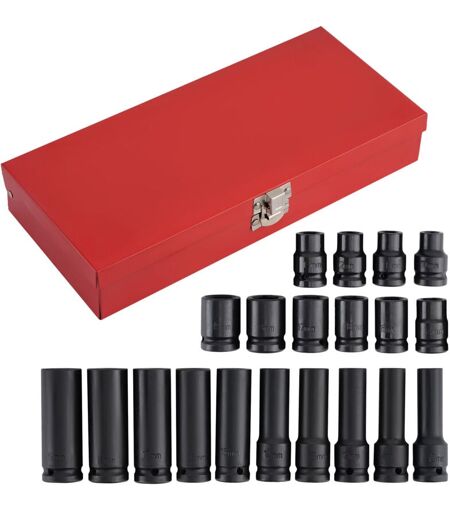 Specification: Material: chrome vanadium steel Color: as picture show Measuring system: metric Sizes: 10-11-12-13-14-15-16-17-18-19 mm Length: approx. 38 mm and 78 mm Included: - 20pcs impact sockets 1/2 " 10 mm x Ø22 mm x 38 mm 11 mm x Ø22 mm x 38 mm 12 mm x Ø22 mm x 38 mm 13 mm x Ø22 mm x 38 mm 14 mm x Ø22 mm x 38 mm 15 mm x Ø22 mm x 38 mm 16 mm x Ø22 mm x 38 mm 17 mm x Ø24 mm x 38 mm 18 mm x Ø26 mm x 38 mm 19 mm x Ø26 mm x 38 mm 10 mm x Ø22 mm x 78 mm 11 mm x Ø22 mm × 78 mm 12 mm x Ø22 mm × 78 mm 13 mm x Ø22 mm × 78 mm 14 mm x Ø22 mm × 78 mm 15 mm x Ø22 mm × 78 mm 16 mm x Ø22 mm × 78 mm 17 mm x Ø24 mm x 78 mm 18 mm x Ø26 mm x 78 mm 19 mm x Ø26 mm x 78 mm - Completely sorted in metal toolcase Advantages: - Warranty: 2 Years guarantee - Condition: completely new / Brand new / fully functional - Return guaranteed - 24H fast shipping Notes: - It is a spare tool, it serves as a replacement for the original tool. - Instructions are not included. We recommend professional installation. ...