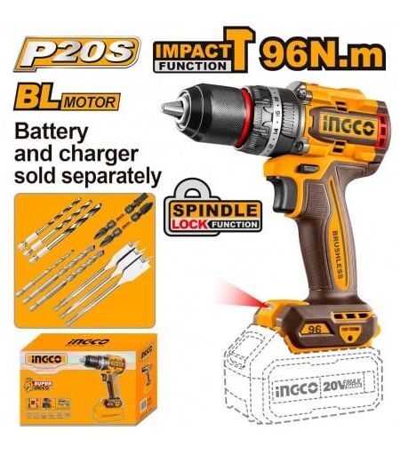 INGCO CIDLI209681 Trapano a percussione a batteria 20 v Brushless 96 nm 13 mm Solo corpo -