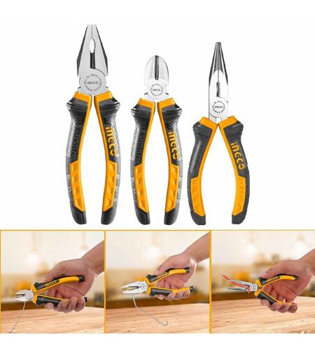 Set di 3 pinze professionali Ingco composto da 1 pinza combinata, 1 pinza a becco lungo e 1 pinza taglio diagonale. Impugnatura Soft Grip Ingco style. Il set include: - Pinza combinata da 20 cm (8") - Pinza a becco lungo da 16 cm (6") - Pinza taglio diagonale da 16 cm (6") Il corpo della pinza è in acciaio di alta qualità, con trattamento termico globale, temprato Prova di durezza 55 65 HRC. Manico in PVC bicolore, Facile da impugnare così da fare meno fatica e aumentare la produttività Uso: adatto per la decorazione della casa, la manutenzione dell'auto, il taglio di fil, il fissaggioe per soddisfare le esigenze di diversi usi Grazie alle dimensioni contenute si può lavorare con flessibilità in spazi ristretti. ...