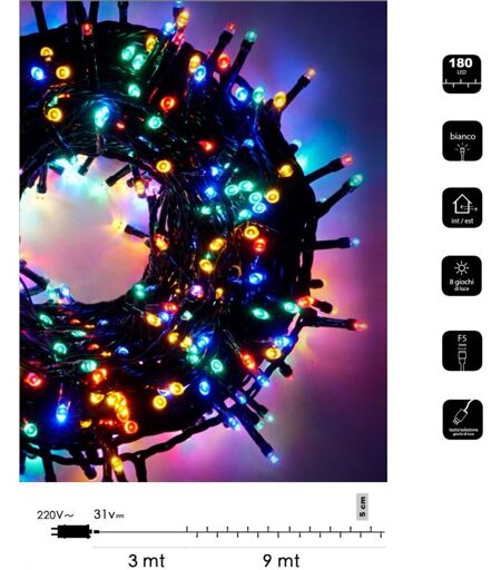 Catena luminosa natalizia composta da 180 led di 5 mm distribuite in 9 metri di cavo verde. Munita di trasformatore e controller con 8 giochi di luci tra cui pure la modalità fissa. Disponibile in 6 colori di luce a scelta fra bianca fredda, calda, multicolore, rosso, blu e rosa. Serie luminose ideali per aree interne ed esterne con grado di impermeabilità IP44. Attenzione: Il trasformatore non può essere collocato sotto la pioggia Caratteristiche tecniche Modello Catena luminosa Tensione nominale 220V 31V Grado di protezione IP44 Grandezza led 5 mm Quantità led 180 Trasformatore Incluso Controller 8 giochi di luce Area di installazione Interna-Esterna Colore cavo Verde Dimensioni Altezza 5 cm Lunghezza cavo con spina 3 mt Lunghezza catena 9 mt Luce disponibile Bianca-Calda-Multicolore-Blu-Rosso-Rosa ...