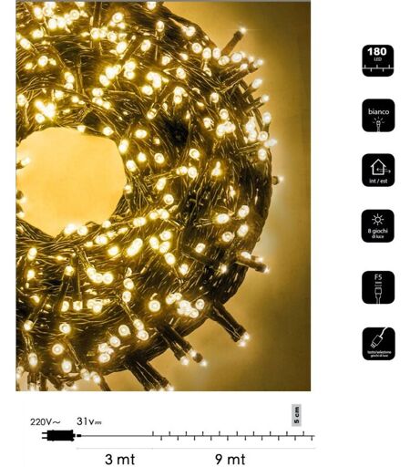Catena luminosa natalizia composta da 180 led di 5 mm distribuite in 9 metri di cavo verde. Munita di trasformatore e controller con 8 giochi di luci tra cui pure la modalità fissa. Disponibile in 6 colori di luce a scelta fra bianca fredda, calda, multicolore, rosso, blu e rosa. Serie luminose ideali per aree interne ed esterne con grado di impermeabilità IP44. Attenzione: Il trasformatore non può essere collocato sotto la pioggia Caratteristiche tecniche Modello Catena luminosa Tensione nominale 220V 31V Grado di protezione IP44 Grandezza led 5 mm Quantità led 180 Trasformatore Incluso Controller 8 giochi di luce Area di installazione Interna-Esterna Colore cavo Verde Dimensioni Altezza 5 cm Lunghezza cavo con spina 3 mt Lunghezza catena 9 mt Luce disponibile Bianca-Calda-Multicolore-Blu-Rosso-Rosa ...