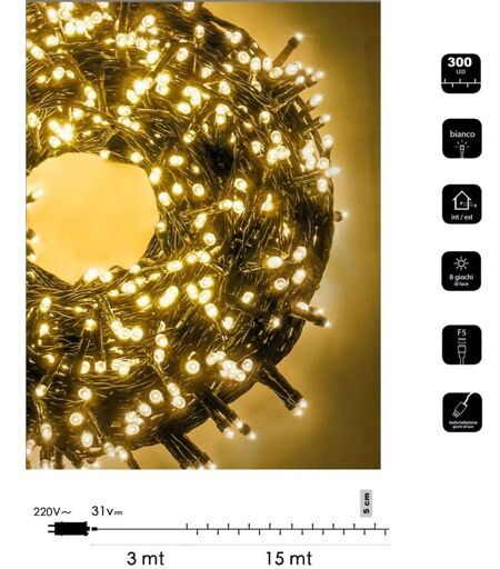 Catena di luci composta da 300 led di 5 mm distribuite in 15 metri di cavo verde. Munita di trasformatore e controller con 8 giochi di luci tra cui pure la modalità fissa. Disponibile in 6 colori di luce: bianca fredda, calda, multicolore, rosso, blu e rosa. Serie luminose ideali per aree interne ed esterne con grado di impermeabilità IP44. ATTENZIONE: il trasformatore non può essere collocato sotto la pioggia Catena Luminosa LED 300 led 15 mt Caratteristiche tecniche Modello Catena luminosa Tensione nominale 220V 31V Grado di protezione IP44 Grandezza led 5 mm Quantità led 300 Trasformatore Incluso Controller 8 giochi di luce Area di installazione Interna-Esterna Colore cavo Verde Dimensioni Altezza 5 cm Lunghezza cavo con spina 3 mt Lunghezza catena 15 mt Luce disponibile Bianca-Calda-Multicolore-Blu-Rosso-Rosa ...