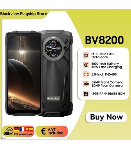 BLACKVIEW BV8200 Telefono robusto 6,5” 2.4K 120Hz Display Helio G100 12GB 256GB NFC Torcia Android 14 Cellulare