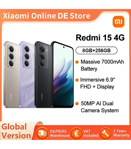 Xiaomi Versione globale Redmi 15 4G Smartphone 8GB/256GB Potente Snapdragon ® 685 AI Doppia Fotocamera 6,9" FHD 7000mAh Super Batteria 33W