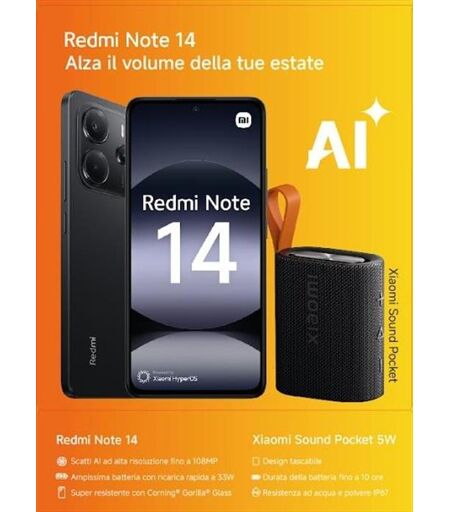 Progettato per durare e resistere nel tempo Redmi Note 14 non teme la polvere e l'acqua grazie alla sua certificazione IP54. Il Corning® Gorilla® Glass Vic tus® 5 sulla parte anteriore offre una migliore protezione contro i graffi dell'usura quotidiana. Maggiore protezione e tranquillità contro le cadute accidentali grazie alla sua resistenza e durata nel tempo. Design e performance premium Redmi Note 14 è progettato per essere elegante grazie alla colorazione ricercata e al tempo stesso confortevole, grazie anche a un grande display. La ricarica turbo da 33W e il display AMOLED fino a 120Hz consentono un’esperienza utente premium ed efficiente. Camera da 108MP con OIS Cattura scatti straordinari con una fotocamera principale da 108MP. Le funzioni di post-editing sono supportate dall’AI che Xiaomi fornisce gratuitamente nella Galleria, consentendo a tutti di elevare la qualità delle proprie fotografie. ...
