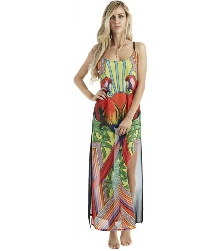 Colorato e leggero con una stampa a pappagallo davanti e un velo nero malizioso dietro, questo abito estivo, ideale come copri costume in vacanza, ricorda l'estate e le giornate di sole e di spiaggia. ...