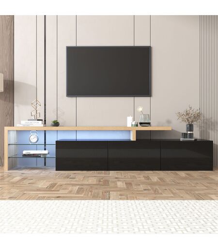 FORTUNA LAI Mobile TV lucido 197,5 L x 39 B x 42H (cm), stile moderno, spazio di archiviazione pratico, effetto legno, ripiani in vetro, illuminazione LED, nero