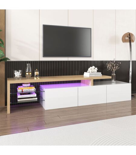FORTUNA LAI Mobile TV lucido 197,5 L x 39 B x 42H (cm), stile moderno, spazio di archiviazione pratico, effetto legno, ripiani in vetro, illuminazione LED, bianco