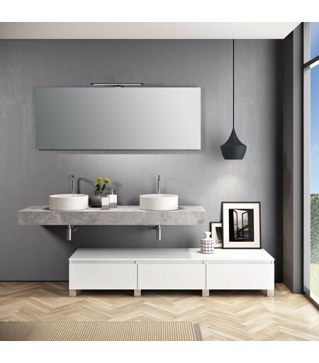 Composizione doppio lavabo 9 pezzi YOKA cemento/bianco opaco • top in mdf scatolato realizzato con tecnologia folding con superficie in pvc antigraffio colore cemento • nr.2 staffe di supporto a scomparsa, in metallo zincato • nr.2 lavabi in ceramica da appoggio colore bianco effetto marmo di caracatta • nr.3 basi con 1 cassetto soft close laccata bianco opaco • nr.1 specchio reversibile, con telaio in ritiro in abs colore argento • nr.1 lampada led a luce naturale 6000k (non sostituibile), 15W, AC220/240V, 50-60Hz, 640 Lumen, IP44, RoHS, CE, classe energetica A++ • nr.1 confezione di piedini inclusi (8 pezzi) • dimensioni top cm. L.165 P.45 H.12 • dimensioni base cm. L.60 P.45 H.27 • dimensioni lavabo cm. L.36 P.36 H.12 • dimensioni specchio cm. L.160 P.2 H.60 • dimensioni lampada cm. L.50 P.10 H.8 • dimensioni composizione cm. L.180 P.45 H.190 • miscelatore e scarico non inclusi • Made in Italy ...