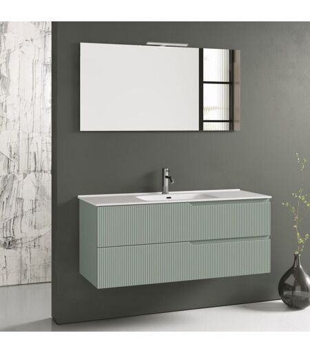 Composizione 4 pezzi ZIP verde salvia • base sospesa con frontali in MDF cannettato, finitura verde salvia • lavabo in ceramica con foro troppopieno • nr.2 cassetti con scorrimento e chiusura soft close • maniglia a gola pantografata • nr.1 specchio reversibile, con telaio in ritiro in abs colore argento • nr.1 lampada led a luce fredda 4000k (non sostituibile), 5W, AC220/240V, 50-60Hz, 380 Lumen, IP44, RoHS, CE, classe energetica F • dimensioni base cm. L.120 P.45 H.50 • dimensioni lavabo cm. L.121 P.46,5 H.20 • dimensioni specchio cm. L.120 P.2 H.60 • dimensioni lampada cm. L.30 P.11 H.8 • dimensioni composizione cm. L.121 P.46,5 H.190 • miscelatore e scarico non inclusi • Made in Italy ...