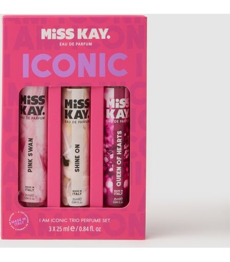 I am Iconic, Trio profumi di Miss Kay. Shine On è una fragranza floreale chic con un caldo tocco orientale con note di gardenia, pesca bianca, pera, gelsomino sambac, fiori d'arancio, tuberosa, patchouli, vaniglia, sandalo, cashmere. Queen of Hearts è una fragranza vivace e dolce, delicatamente fiorita con note di bergamotto, pompelmo, gelsomino, tiaré, eliotropo, sandalo, muschio. Pink Swan è una fragranza fiorita delicata, una tenerezza preziosa come la seta con note di limone, bergamotto, frangipani, gelsomino, ylang ylang, osmanto, eliotropio, rosa, cocco, sandalo, muschi. ...