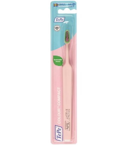 TePe COLOUR COMPACT - ROSA PASTELLO - Descrizione Spazzolino con setole extra - soft di colore rosa pastello. Testina affusolata per un accesso migiore, setole arrotondate per una pulizia edefficiente. Collo angolabile sotto acqua per un accesso facilitato. Setole bicolori: verde e rosa. - Componen… ...