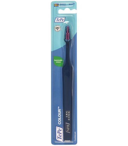 TePe COLOUR - BLU SCURO - Descrizione Spazzolino con setole soft di colore blu scuro. Testina affusolata per un accesso migiore, setole arrotondate per una pulizia edefficiente. Collo angolabile sotto acqua per un accesso facilitato. Setole bicolori: blu e rosa. - Componenti Manico: polipropilene (… ...