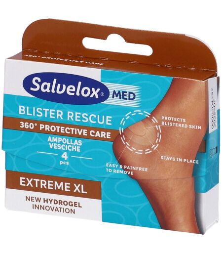 Salvelox Med Blister Rescue Extreme XL Cerotti per Vesciche 74mm x 45mm Nuovo ed originale design, con cuscinetto idrogel, resta attaccato stabilmente ma allo stesso tempo è facile ed indolore da rimuovere. Le persone con problematiche di guarigione delle ferite, ad es. diabetici/anziani, devono controllare regolarmente lo stato delle vesciche. Non applicare su ferite ematiche o profonde, con abbondante sanguinamento o infette. Formato: 4 cerotti 74mm x 45mm. ...
