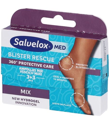 Salvelox Med Blister Rescue Mix Cerotti per Vesciche Nuovo ed originale design, con cuscinetto idrogel, resta attaccato stabilmente ma allo stesso tempo è facile ed indolore da rimuovere. Le persone con problematiche di guarigione delle ferite, ad es. diabetici/anziani, devono controllare regolarmente lo stato delle vesciche. Non applicare su ferite ematiche o profonde, con abbondante sanguinamento o infette. Formato: 3 cerotti 72mm x 42mm; 3 cerotti 56mm x 24mm. ...