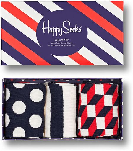 3 paia di calze alte con stampe diverse per migliorare il tuo look con un tessuto morbido. Le calze più alla moda del momento Happy Socks! Queste calze sono molto popolari grazie ai loro motivi originali e all´alta qualità. Paio di calze colorate con righe, gradini e pois in blu e rosso. ...