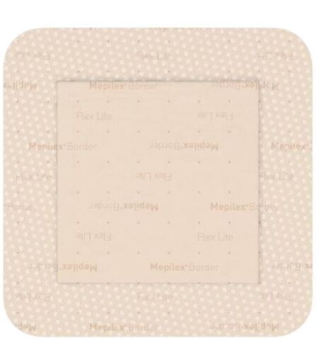 Mepilex Border Flex Lite - Descrizione Medicazione assorbente multistratificata a quattro strati in schiuma di poliuretano, con bordo, strato di contatto in silicone morbido Safetac e struttura fessurata con Tecnologia Flex. 1)Film esterno in poliuretano altamente traspirante e impermeabile ai liqu… ...