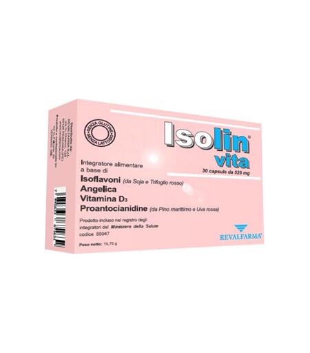 Isolin vita Descrizione Integratore alimentare a base di estratti vegetali di soia, trifoglio rosso, angelica, pino marittimo ed uva rossa con vitamina D3. La soia, l'angelica e il trifoglio rosso possono contribuire a contrastare i disturbi della menopausa. Il pino marittimo e l'uva rossa ricchi di proantocianidine possiedono attività antiossidante. Inoltre l'uva rossa può contribuire alla funzionalità del microcircolo. La vitamina D3 contribuisce al mantenimento di ossa normali. Ingredienti Soia (Glycine Max L. Merr.) semi e.s. tit. 40% in isoflavoni, uva sorrda (Vitis vinifera L.) semi e.s. tit. 95% in proantocianidine, angelica (Angelica sinensis D., malodestrina), radice e.s. tit. 1% in ligustilide, trifoglio rosso (Trifolium pratense L. maltodestrina) erba fiorita e.s. tit. 20% in isoflavoni, pino marittimo (Pinus pinaster Aiton, maltodestrina) corteccia e.s. tit. 90% in proantocianidine, vitamina D3 (colecalciferolo, gomma d'acacia, saccarosio, amido di mais, trigliceridi a catena media, alfa-tocoferolo); antiagglomerante: silice micronizzata; involucro esterno: gelatina; colorante: titanio biossido. Senza glutine e lattosio. Caratteristiche nutrizionali Valori medi Per 1 capsula Soia 170 mg Uva rossa 85 mg Angelica 80 mg Trifoglio 60 mg Pino 22 mg Vitamina D3 15 mcg (300% VNR*)*VNR: Valori Nutritivi di Riferimento. Modalità d'uso Una capsula al giorno da deglutire senza masticare, al momento della colazione o del pasto principale. Avvertenze Tenere fuori dalla portata dei bambini al di sotto dei tre anni. Non assumere in gravidanza o durante l'allattamento. Gli integratori non vanno intesi come sostituto di una dieta variata, equilibrata e di un sano stile di vita. Non eccedere la dose giornaliera raccomandata. In caso di allergia accertata o intolleranza verso uno più componenti presenti nel prodotto, se ne sconsiglia l'utilizzo. Non consumare decorso il termine ultimo di conservazione. Conservazione Conservare in luogo fresco e asciutto, lontano da fonti di luce e di calore. Validità a confezionamento integro: 24 mesi. Formato Confezione da 30 capsule da 525 mg. Peso netto: 15,75 g. ...