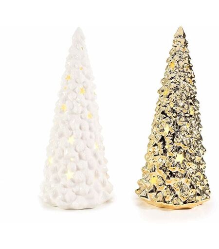 Alberelli di Natale da appoggiare realizzati in ceramica e completi di luce Led dalle tonalità bianco caldo Indicati per addobbare casa, ufficio e negozi in occasione del Natale o come idea regalo In set da 2 alberelli, uno bianco ed uno dorato Ciascuno misura base 14,5 x altezza 33 centimetri Batterie incluse ...