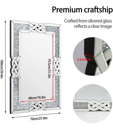 TEMU Large Rectangle Crushed Diamond Wall Mirror Diamante Gems Crystal Sparkly Accent Silvery Mirror Home Hallway Deco, 100x70cm, 1pc