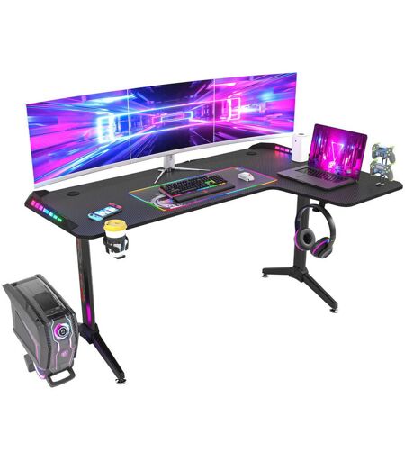 FATIVO Scrivania gaming 160cm Angolare con LED RGB Il grande tavolo da gioco migliora la tua esperienza di gioco, perfetto per il lavoro e il gioco. Tavolo da gioco ergonomico a forma di L, si adatta perfettamente all'angolo e risparmia molto spazio. Ampio spazio sul tavolo per 3 monitor da 24", controller, console, tastiera, mouse. Scrivania ad angolo a forma di L, lato -L e lato -R per opzione, utilizza efficacemente lo spazio. La scrivania offre molto spazio per le gambe, puoi sederti comodamente con un maggiore spazio di archiviazione. Costruito con fantastiche luci a led RGB, facili da controllare tramite il pulsante sulla superficie. Regola facilmente 6 colori di illuminazione e 8 modalità, sembra fantastico, crea atmosfera durante il gioco. Il piano del tavolo in MDF con trame in fibra di carbonio, resistente all'usura, facile da pulire. Il telaio delle gambe realizzato in robusto metallo, lo mantiene più stabile e stabile. Pedana regolabile sul fondo, aiuta a mantenere ...