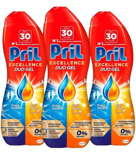Ottieni una pulizia impeccabile con Pril Excellence Duo Gel, il detergente liquido per lavastoviglie con formulazione bifase che unisce potere sgrassante profondo e azione anti-odore con aceto. Questa confezione contiene 3 flaconi da 600 ml, per un totale di fino a 90 lavaggi. Grazie alla sua tecnologia a doppio gel, agisce anche nei cicli brevi e a basse temperature, garantendo brillantante incluso, 0% residui, e una brillantezza eccellente su bicchieri, stoviglie e pentole. Pril Duo Gel Excellence: l'efficacia professionale direttamente nella tua lavastoviglie, per un pulito brillante e senza compromessi. ...