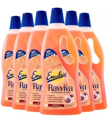Prenditi cura dei tuoi pavimenti con il detergente Emulsio Ravviva Cotto, studiato per cotto tradizionale, moderno, ardesia e superfici in pietra naturale porosa. Questa inserzione contiene 6 flaconi da 750 ml ciascuno, perfetti per garantire una pulizia efficace, delicata e profumata nel tempo. La sua formula protettiva avanzata pulisce a fondo senza lasciare aloni, ravviva il colore originale del pavimento e ne esalta l’aspetto naturale. Inoltre, sprigiona una piacevole e duratura fragranza di fiori bianchi e violetta, che rende l’ambiente fresco e accogliente. Ogni flacone è composto per il 50% da plastica riciclata, per una scelta più sostenibile. ...