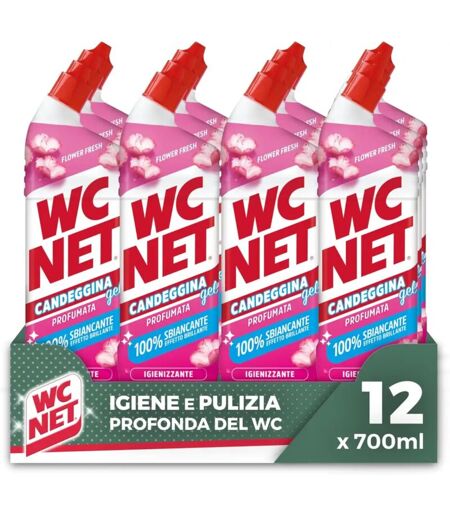 Wc Net Candeggina Gel Profumata è il detergente ideale per garantire una pulizia profonda e igienizzante di sanitari e superfici. La sua formula avanzata combina l'azione sbiancante della candeggina con il potere igienizzante, eliminando germi e batteri in modo efficace. La fragranza Flower Fresh lascia un profumo fresco e delicato che dura a lungo, rendendo l'ambiente pulito e piacevole. Grazie alla consistenza gel, il prodotto aderisce perfettamente alle superfici, assicurando una pulizia uniforme e senza sprechi. È perfetto per rimuovere macchie difficili e per mantenere i tuoi sanitari e altre superfici sempre in perfette condizioni. La confezione da 700 ml x 12 garantisce una lunga durata e una soluzione pratica ed economica per un'igiene quotidiana completa. Wc Net Candeggina Gel Profumata è l'alleato perfetto per una pulizia profonda, sicura e profumata in ogni angolo del tuo bagno. ...