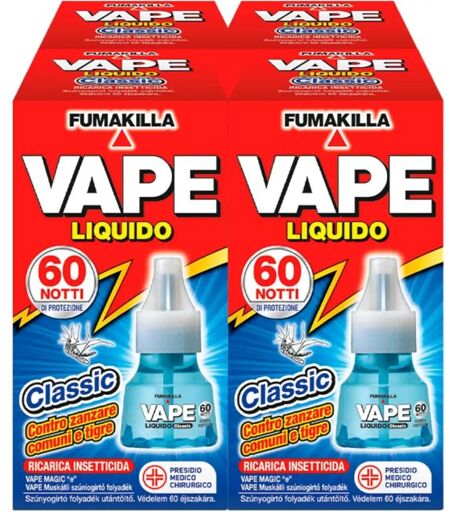 Proteggi la tua casa dalle zanzare e dalle mosche con le ricariche liquide Vape Classic 60 Notti. Questo set da 4 flaconi garantisce una protezione efficace fino a 180 notti, assicurando un ambiente tranquillo e sicuro, anche a finestre aperte e luci accese. La formula insetticida agisce in modo silenzioso e continuo, tenendo lontane zanzare comuni, zanzare tigre e mosche, senza produrre fumo o cattivi odori. Ogni flacone è facile da installare nel diffusore elettrico Vape (non incluso) e funziona per circa 8 ore per notte, coprendo stanze fino a 20 metri quadrati. Si tratta di un Presidio Medico Chirurgico regolarmente registrato, sicuro per l’uso domestico se impiegato correttamente. Le ricariche sono ideali per l’uso quotidiano in camera da letto, soggiorno, cucina o ufficio, offrendo una protezione affidabile anche durante le notti estive più calde. ...