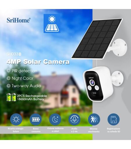 SRIHOME SH033B Telecamera Wi-Fi Batteria Senza Fili,Visione Notturna a Colori, Rilevamento Persona,IP65,Audio,Pannello Solare -