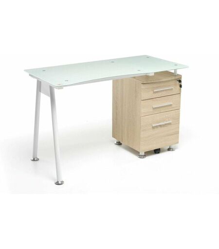SCRIVANIA RECORD RovereDescrizione:Workstation Casa / Ufficio Scrivania con struttura in acciaio verniciato di colore bianco, piano in vetro temperato 8mm di colore bianco latte, cassettiera girevole con 3 cassetti di colore rovere. Mis.: 120x60 ...