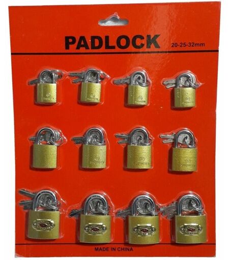 Set da 12 lucchetti di varie misure. Ideali per armadietti, valige, ecc. Specifiche Con 2 chiavi 4 Lucchetti da 20mm 4 Lucchetti da 25mm 4 Lucchetti da 32mm ...